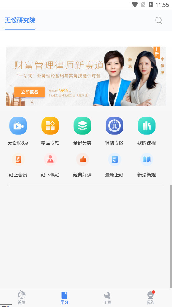 无讼学院汇聚业内权威师资力量,致力于为法律人搭建专业的学习平台。平台课程形式丰富多样,包含直播课程、视频课程以及线下面授等,内容覆盖民法精解、刑事辩护、商经前沿、行业观察等多个专业领域,陪伴法律人共同成长。每晚8点的直播课程,能让你与律界大咖在线零距离互动交流,直播结束后还支持课程回看,方便随时巩固学习。