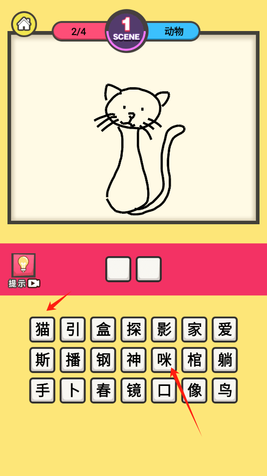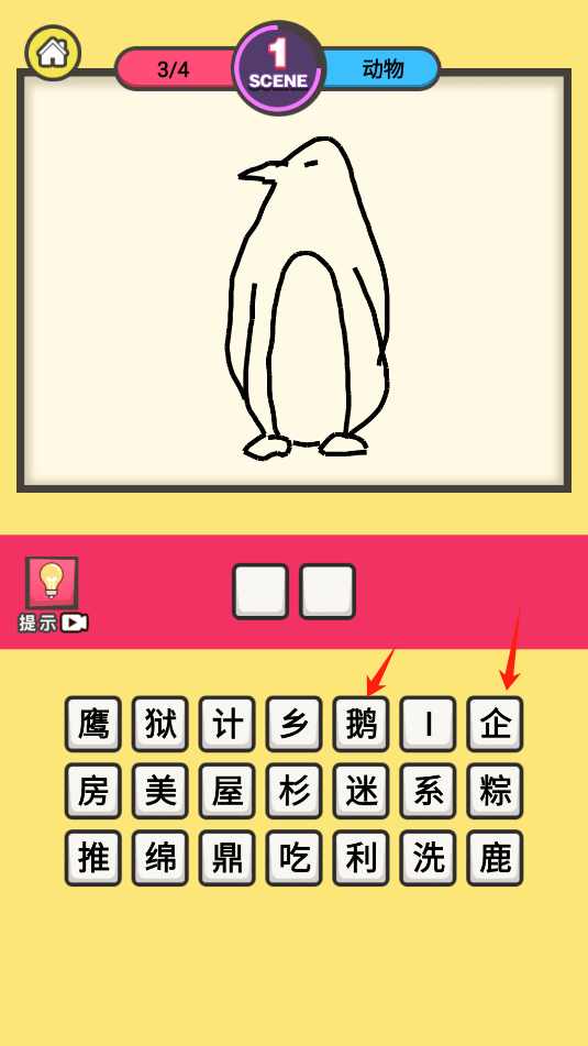 2、在游戏过程中,依据系统所绘制出的动物形象,从下方给出的汉字里进行选择。
