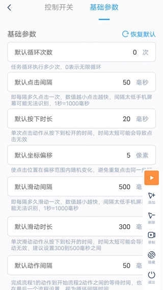 2、找到默认点击间隔与默认按下时长的设置项,将它们调整到能够实现最快点击的状态!