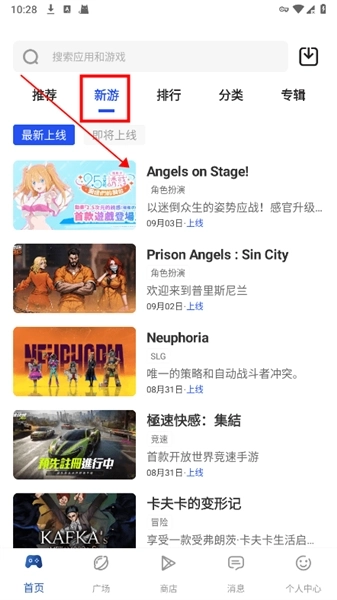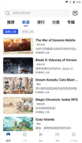 2、在新游栏目中,能够看到最新上线的游戏以及即将上线的游戏。