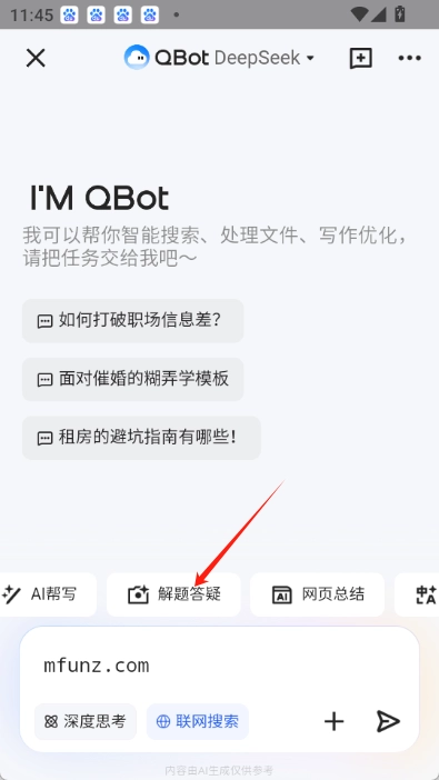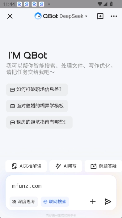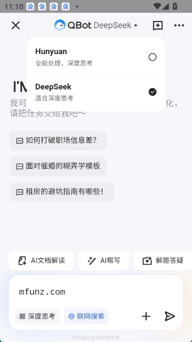 QQ浏览器QBot是腾讯旗下产产品QQ浏览器全新提出的ai智能大模型,说白了就是腾讯qq浏览器升级为ai浏览器了,目前可选deepseek和hunyuan两种模式,deepseek适合深度思考,而hunyuan则是全能处理,深度思考也支持,大家在使用过程中可以自己行选择,除了深度思考还支持联网搜索,包括文档处理、ai翻译、ai帮写等功能一个都不少。