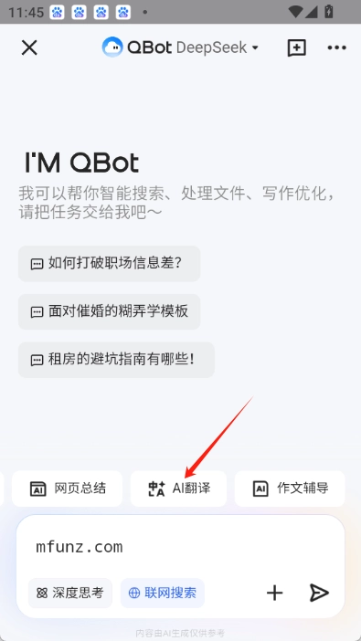 5.浏览外文网页时,点击QBot图标,选择“AI翻译”,即可翻译当前网页