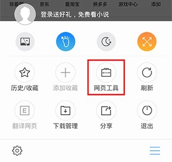 步骤二:在弹出的【网页工具】选项栏中,就可以使用已有的插件,