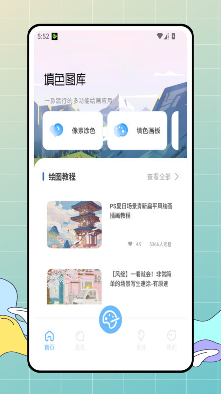 首页将提供像素涂色、填色画板、色彩搭配等功能,用户也能在此了解各类绘图教程。