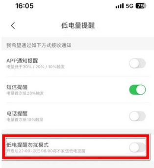 4、打开按钮,即可开启低电提醒勿扰模式。