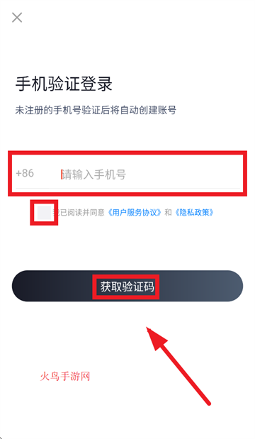 跳转至登录界面后,输入手机号,勾选“我已阅读并同意《用户服务协议》和《隐私政策》”,点击获取验证码完成登录即可。