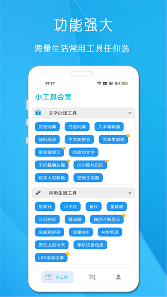 小工具合集是一款面向安卓用户的实用工具类应用,集多种功能于一体,能让你快速找到所需工具,节省不少时间。它涵盖了图像处理、文字处理、音频处理、生活工具、测量操作等丰富功能,所有工具均免费提供,操作便捷,一键即可使用。无论是日常生活还是专业测量场景,都能满足你的需求,带来诸多便利。有需要的小伙伴,欢迎前来体验!