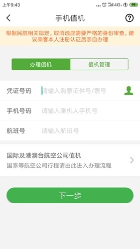 1、首先我们点击主界面的【手机值机】,就可以进入输入我们航班信息的界面了。