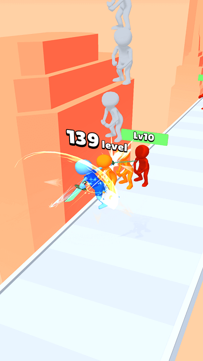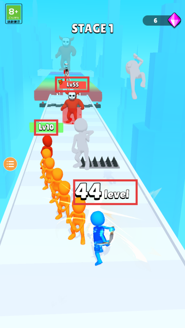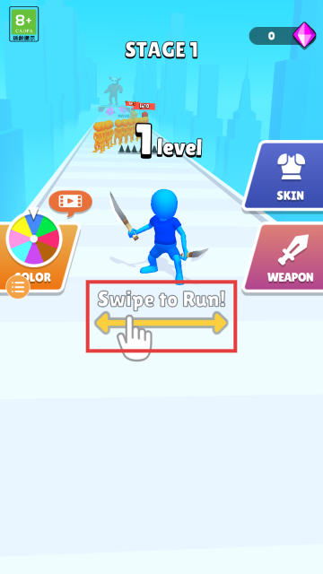 1、进入【STAGE-1】的起始界面后,按照屏幕上【Swipe-to-Run!】的提示滑动屏幕,即可操控蓝色角色手持武器,开启跑酷战斗的旅程。