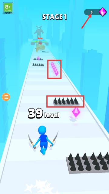 2、进行跑酷运动时,要避开带有【尖刺】的障碍,优先去拾取【紫色钻石】,在积累资源的过程中,留意右上角钻石数量的变化情况。