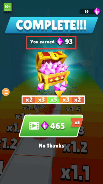 4、完成【STAGE-1】关卡后可领取【93】钻石奖励,你可以选择观看广告将奖励翻倍,也可以直接点击【No-Thanks】进入下一关。