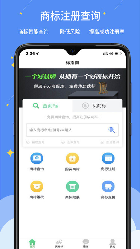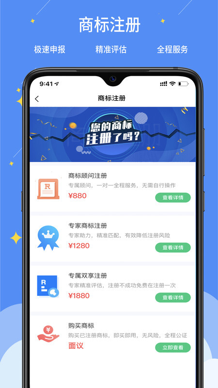 2、【商标注册】提供在线咨询服务,注册前进行查询可提升注册成功率,支持快速申请且当天即可提交,提交后1个工作日内下发商标回执。