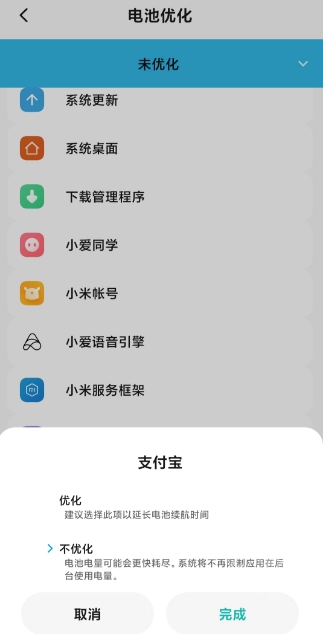 4.接下来,你要做的就是把一些没用的服务都强制打开电池优化。如果你点击了一个应用,并没有弹出电池优化的窗口,就说明它无法关闭。