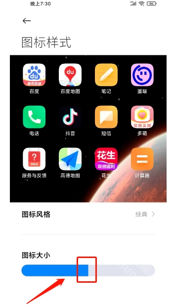 3.进入图标样式界面,拖动“图标大小”下发选项进行调整图标大小。