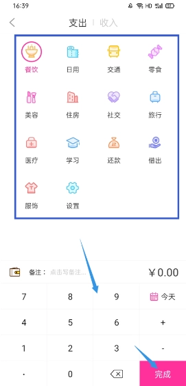 3、选定支出或收入后,找到对应的类别,并输入相应的金额。