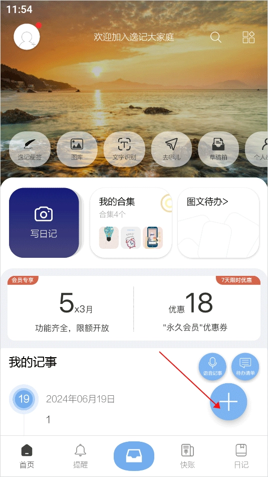1、打开逸记,来到用户首页,点击右下方的“加号”图标;