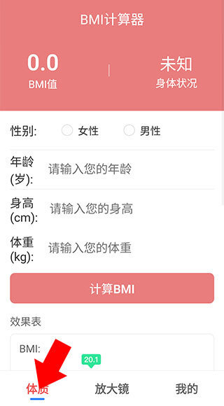 2、在界面中依据提示选择年龄、性别、身高、体重等参数,就能轻松计算出BMI并判断当前健康状况