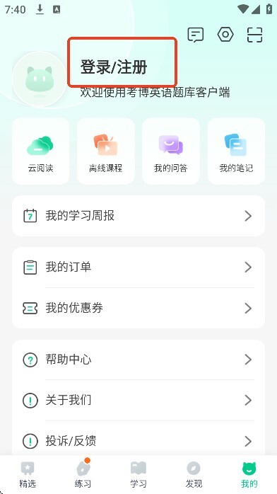 1、在本站安装考博英语题库后,打开软件进入首页,点击右下角的【我的】