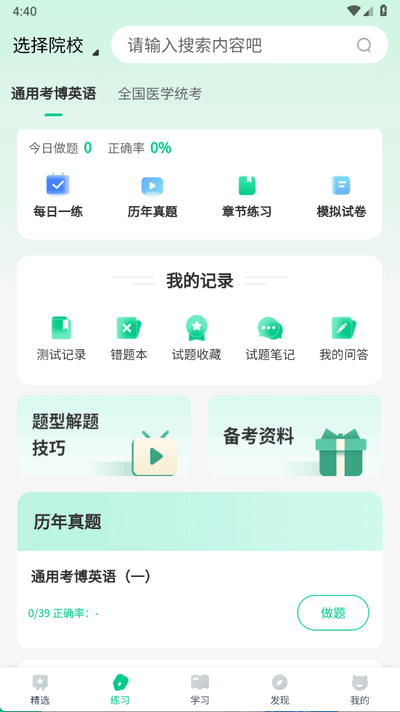软件配备了逼真的模拟考场、历年真题练习、每日一练、快速练习、考点练习、考试押题卷、做题记录等多种学习与做题模式,以丰富多样的形式助力用户备考医学考博英语。此外,软件内还提供医学考博英语统考真题卷供用户使用。