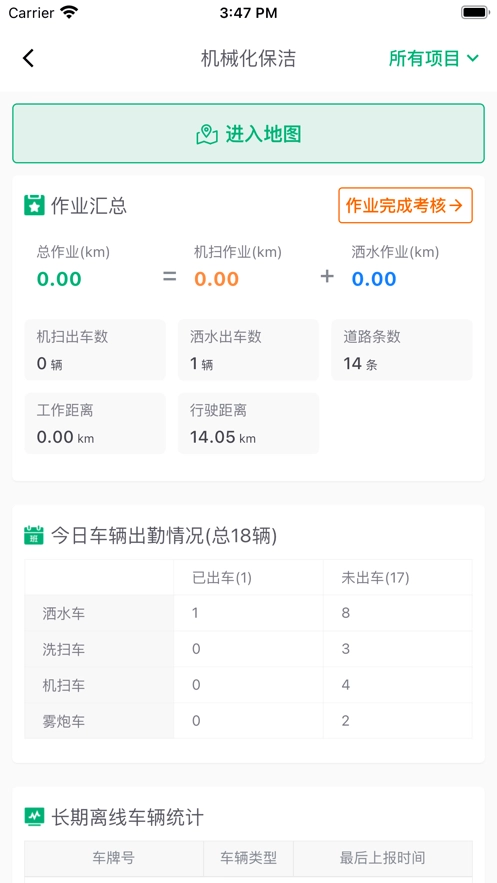 进入地图后,页面下方设有项目数据统计表,右侧则列有作业记录和作业模式两个栏目。通过切换这些栏目,可以查询不同项目的作业汇总。地图上以不同颜色标记路段,红色表示未完成,绿色表示已完成,这样的设计便于用户清晰地区分各个路段的作业进度。