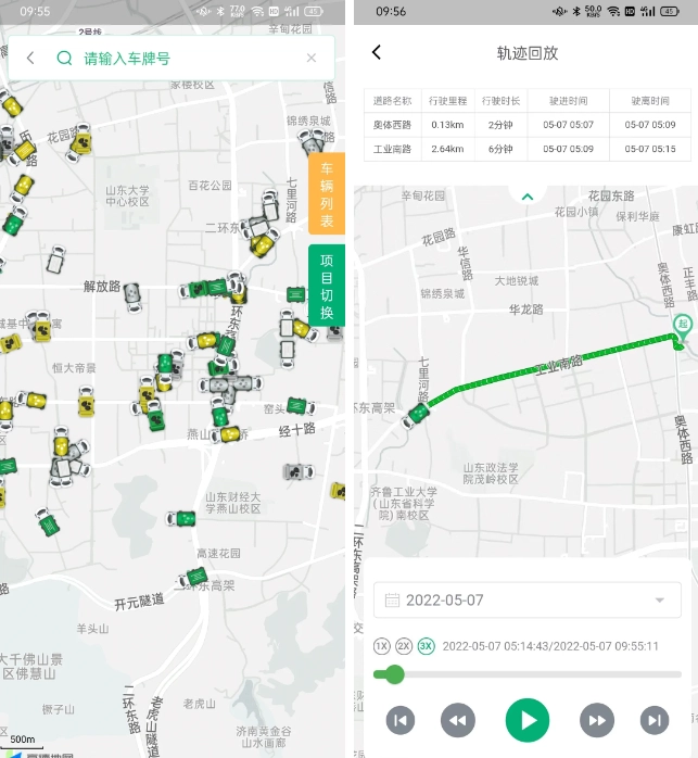 在车辆列表栏目中输入车牌号即可查找车辆,右侧可切换列表和项目,方便快速选择。