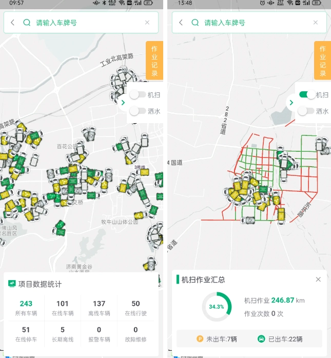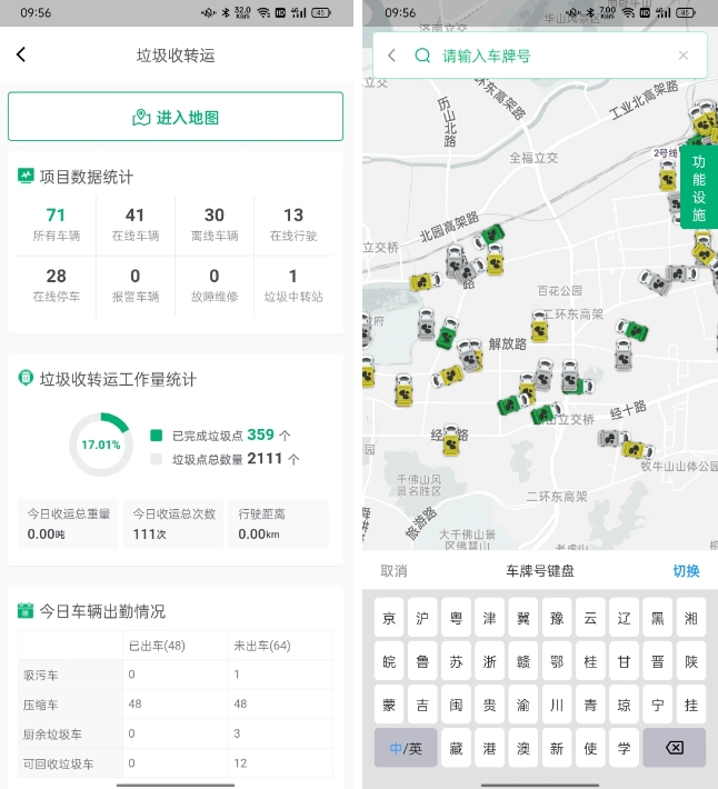 垃圾收转运栏目提供项目数据统计、工作量统计和今日车辆出勤情况,方便实时监管。地图模式可切换垃圾站和中转站,输入车牌号即可查找车辆,查看轨迹和实时视频。