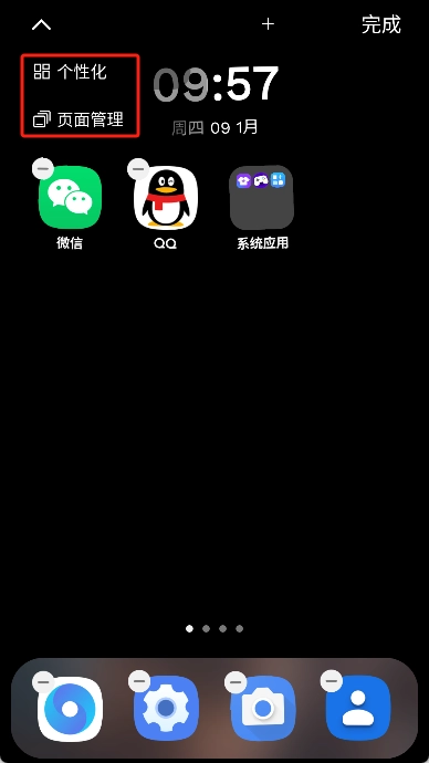 3、长按桌面并点击左上角的三个小点,可以选择个性化和页面管理。