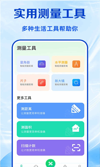 3、配备AR直尺、量角器、水平仪、放大镜、手电筒、温度计、湿度计等各类实用工具,可全方位覆盖用户在不同场景下的测量需求。