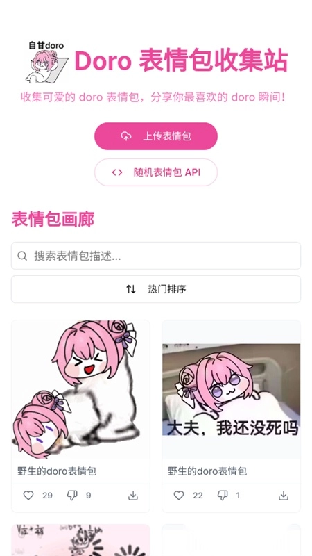 Doro表情包收集站又叫Doro表情包收藏站是一款专注于表情包收集与分享的。Doro表情包收藏站软件为喜欢roro的用户提供了一个丰富多样的表情包资源库,无论是热门的影视角色、可爱的动物,还是搞笑的场景,都能在这里找到。Doro表情包收集站的调性非常轻松有趣,非常适合喜欢在聊天中使用表情包来表达情感的用户。还可以随机生成表情包api,也支持上传表情包。