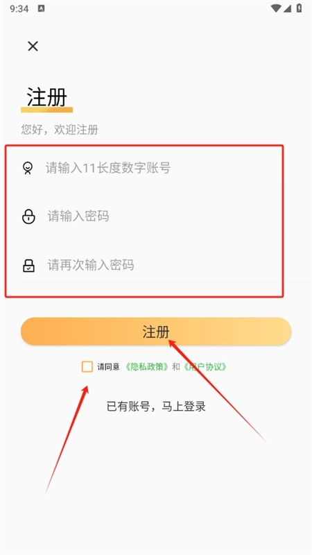 3、输入账号密码,同意隐私政策和协议后点击注册即可
