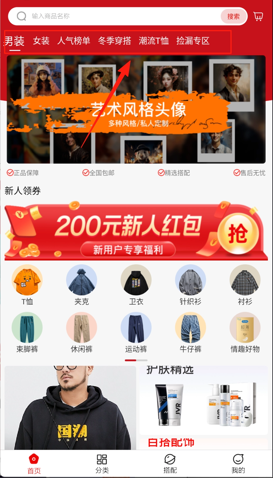1、进入软件之后,我们就能在首页进行各类服装的购买,如夹克、卫衣、针织衫、衬衫、T恤等。