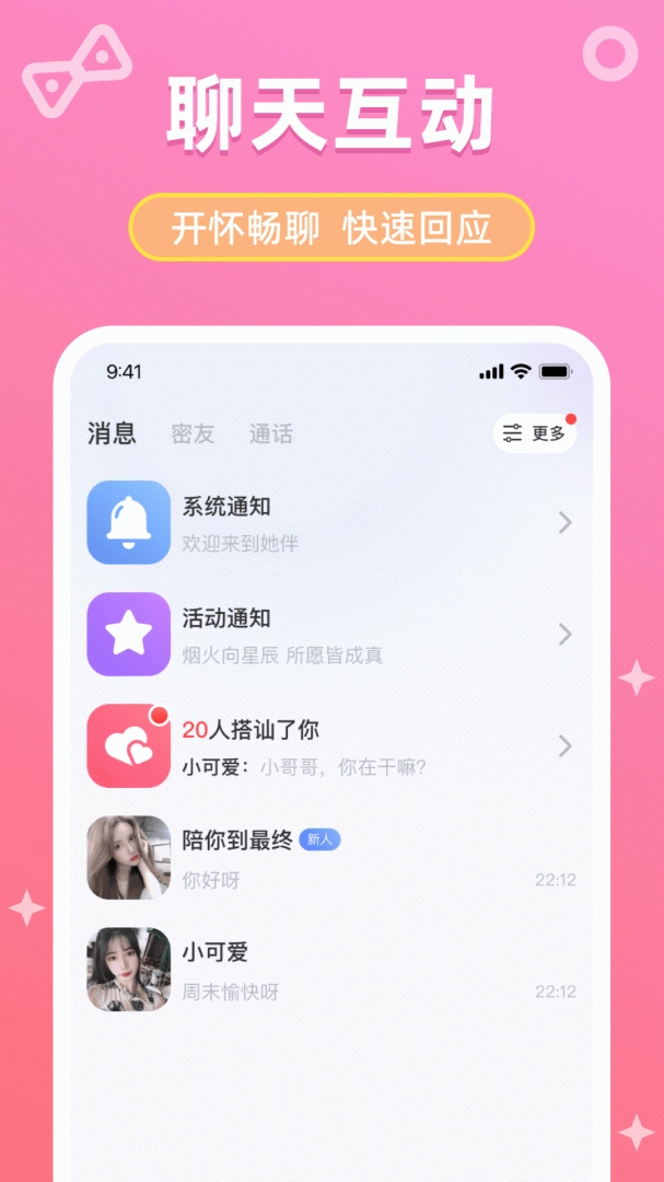 她伴能够根据用户的个人喜好、兴趣爱好、地理位置等多维度信息,进行高效匹配和智能推荐。支持文字、语音、视频通话等多种交流方式。此外,严格的实名认证和多种隐私保护机制,营造了一个安全可靠的交友环境。