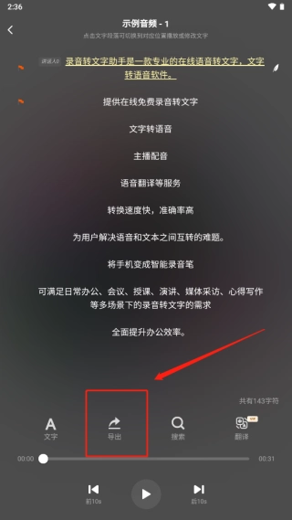 3、页面会实时显示转换后的文字内容,核对无误后点击「导出」。