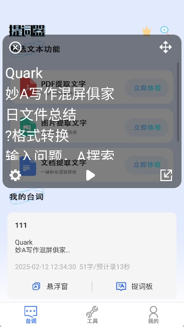 - 悬浮窗提词:支持开启悬浮窗功能,实现任意界面的提词展示。