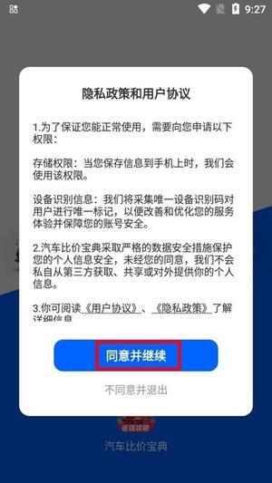 在it猫扑itmop安卓网打开汽车比价宝典软件,阅读弹出的隐私政策与用户协议后,点击【同意并继续】按钮进入应用。