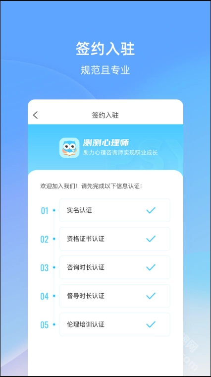 3、签约入驻:欢迎有资质有助人热情的你加入测测心理师,为更多有需要的人提供帮助