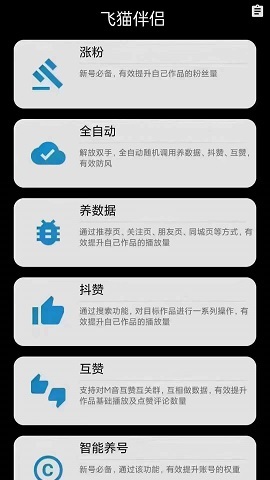飞猫伴侣是一款为广大自媒体用户量身打造的实用涨粉工具,专注于账号运营,通过对用户作品进行点赞、关注和评论,助力提升作品人气。感兴趣的朋友不妨来试试这款养号神器!