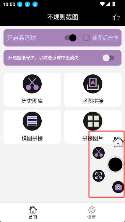 不规则截图相比其他的截图软件,多了很多功能,比如横图拼接、竖图拼接等,而且还可以开启悬浮球,这样我们在第三方时可以随时截图,不用来回切换。不规则截图的功能远不止这些,大家可以自行去体验。