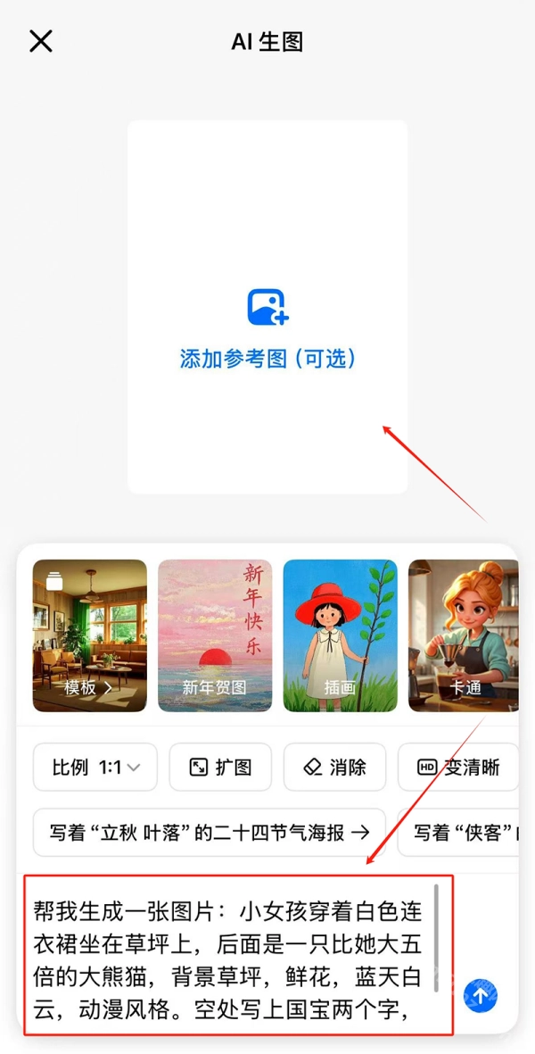 2、在【AI生图】界面,输入想要的创作的具体内容,同时,记得标注好需要生成的文字内容、位置、字体等相关要求;还可以在界面上方添加参考图,使生成的图片更准确。