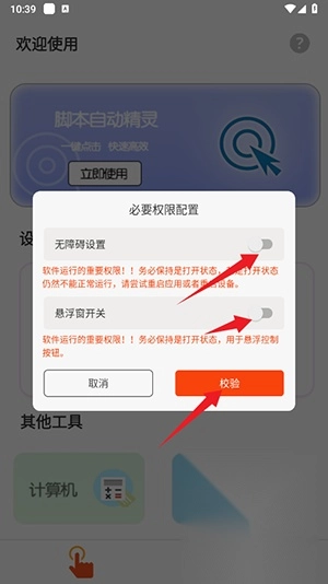 3、开启【无障碍设置】和【悬浮窗开关】,点击【校验】确保开启成功。
