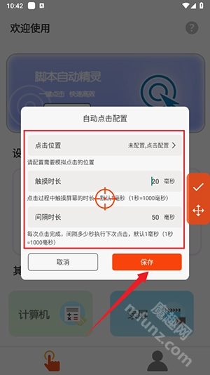5、在设置界面配置自动点击参数,如点击位置、触摸时长、间隔时长等。