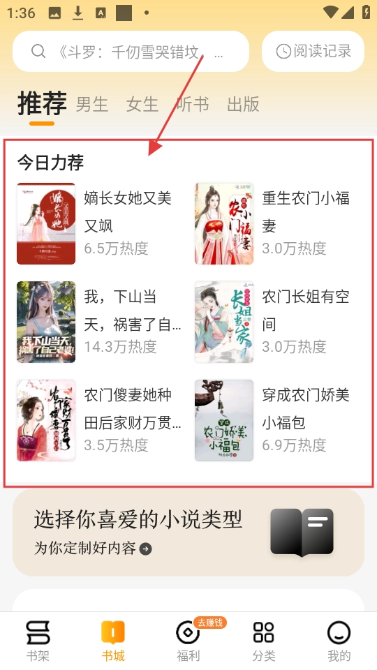 1、在书城推荐页面,点击今日力荐的书籍,如《嫡长女她又美又飒》,可进入书籍详情页啦。