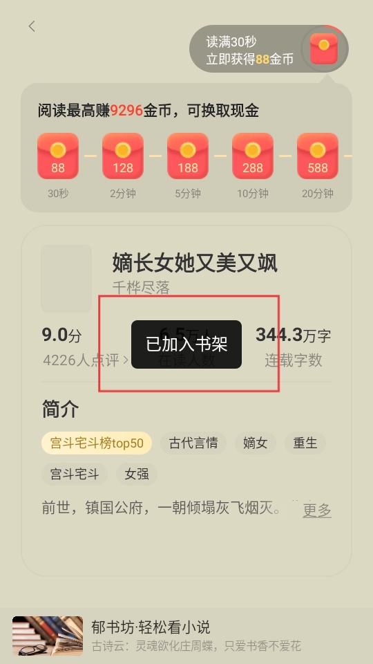 3、点击加入书架后,会提示已加入书架,说明操作成功啦。