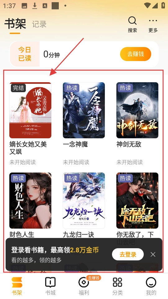4、进入书架页面,可查看已加入书架的书籍,如《嫡长女她又美又飒》,方便随时阅读哦。