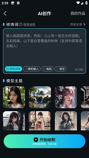 4、在AI绘画页面可以输入具体的修饰词,选择我们钟爱的模型主题。