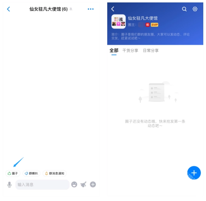 1、群主可以在群聊界面中点击“圈子”快捷入口,进入并开启圈子。