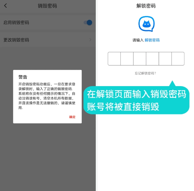 设置并开启【销毁密码】,在解锁页面输入销毁密码,也可注销账号。