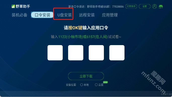U盘安装:野草助手安装包到U盘,插到电视USB接口,打开媒体中心,设置商场模式为开启,安装应用。