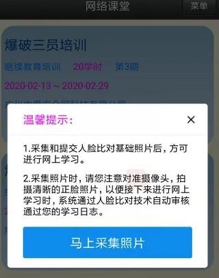 5、选好后,点击【网上学习】进入,此时会出现采集照片的提示,接着点击【马上采集照片】,即可进行照片采集,具体操作可参照下图: