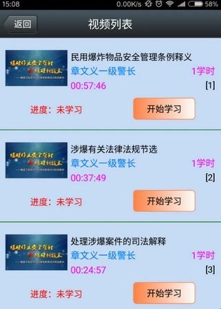 7、在视频列表界面,点击对应视频的“开始学习”按钮,即可开始学习该视频。